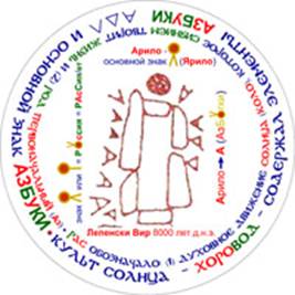 Возвращаясь к первоисточнику культуры в Лепенском Вире, без которого не возникла бы и Винча как первоисточник цивилизации, указываю, что на этом идоле/культе, где представлен круг Солнца и его лучи (сияние) написано: РАсСия-ет или по современным правилам русского языка - РОсСия. До царя Михаила Ф. Романова (1613 год) слово РосСия писалось через лигатуру о/у , которая сверху вниз была именно запрещенным знаком Арила – Аз/ , из-за чего до сих пор слово Россия произносится как РАсСия. Это истинное научное объяснение, почему государство называется Россия, а народ – р сский/рУсский, что означает: род Аз (первоначальный)